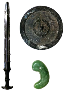 There are 3 Imperial Regalia of the Japanese Monarchy. This includes the legendary sword called Kusanagi-no-Tsurugi. This image is a imagined understanding of what it would have looked like. It is very important to Shinto belief.The Legend of the Kusanagi no Tsurugi explained with animation