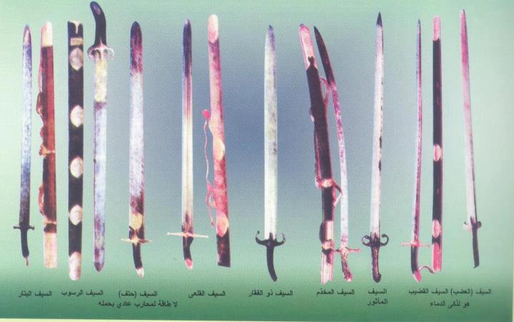 Swords belonging to Prophet Muhammad of the Muslim Tradition. Most of these would be considered as Saif. The first sword is referred to as Al-Battar and the Sword of the Prophets. It has the name of Abrahamic Prophets inscribed: David (Dawood), Moses (Musa) Solomon (Suleiman), Aaron (Haroon), Zacharia (Zakariya), John (Yayha), Jesus (Isa), Joshua (Yusha), & Mohammad.